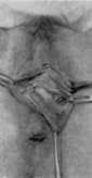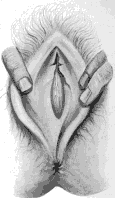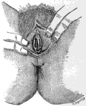 Fig.41. Vagina septa, durch Vorziehen mit Hakenzangen anschaulich gemacht; das Septum entspringt vorn hinter der Harnröhrenöffnung, hier beträgt sein Durchmesser 4, an der hinteren Insertion 8 cm. Das Septum weist ein ovales, schmalrandiges Loch auf. 31-jährige Frau, welche einmal abortiert und einmal spontan geboren hat. (LOEBINGER, KÜSTNER-NEISSERS Stereoskop. Atlas.)